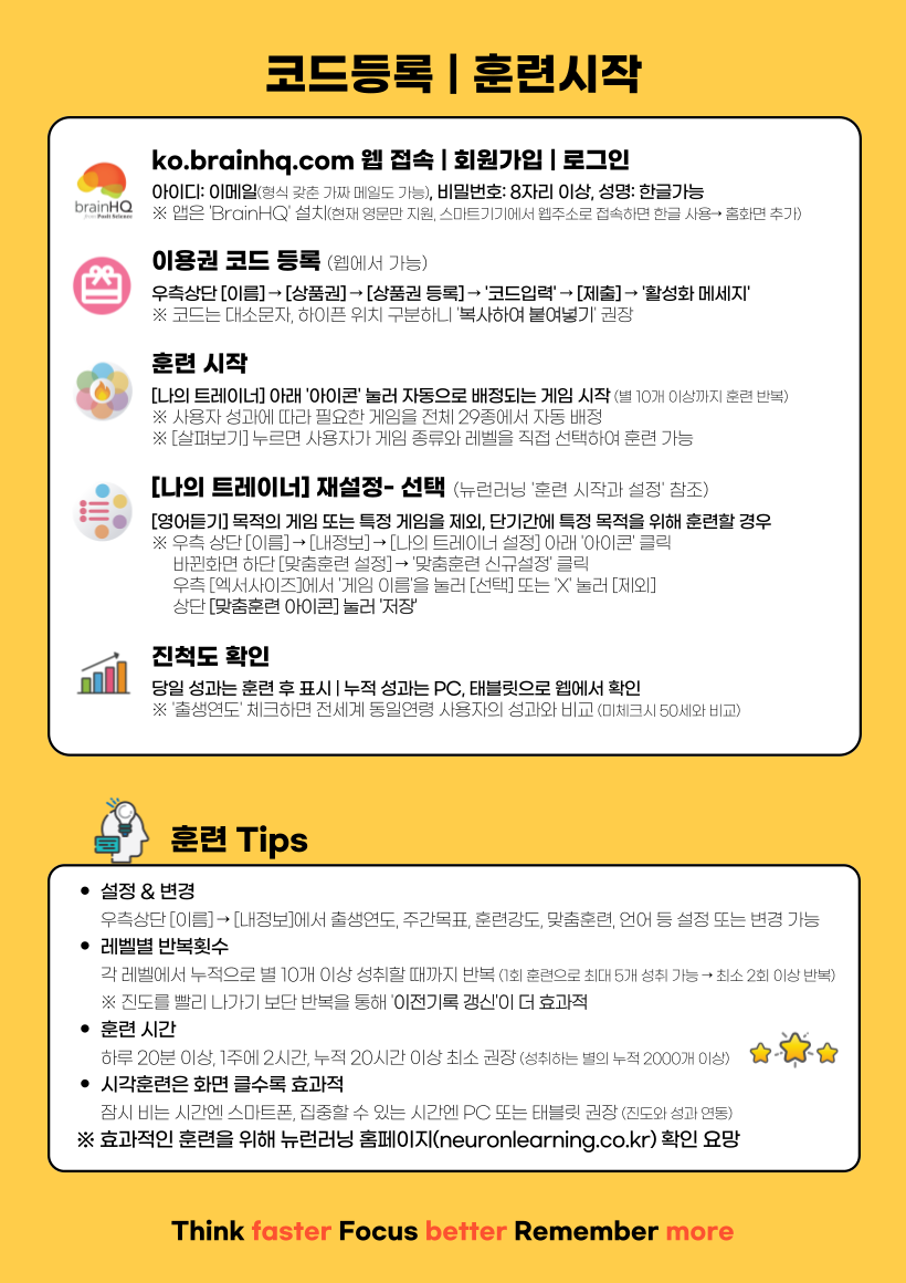 - 코드등록: ko.brainhq.com [로그인] ▶ 우측상단의 [이름] ▶ [상품권 등록] ▶ "코드 입력" ▶ [제출] ▶ "활성화 메세지"